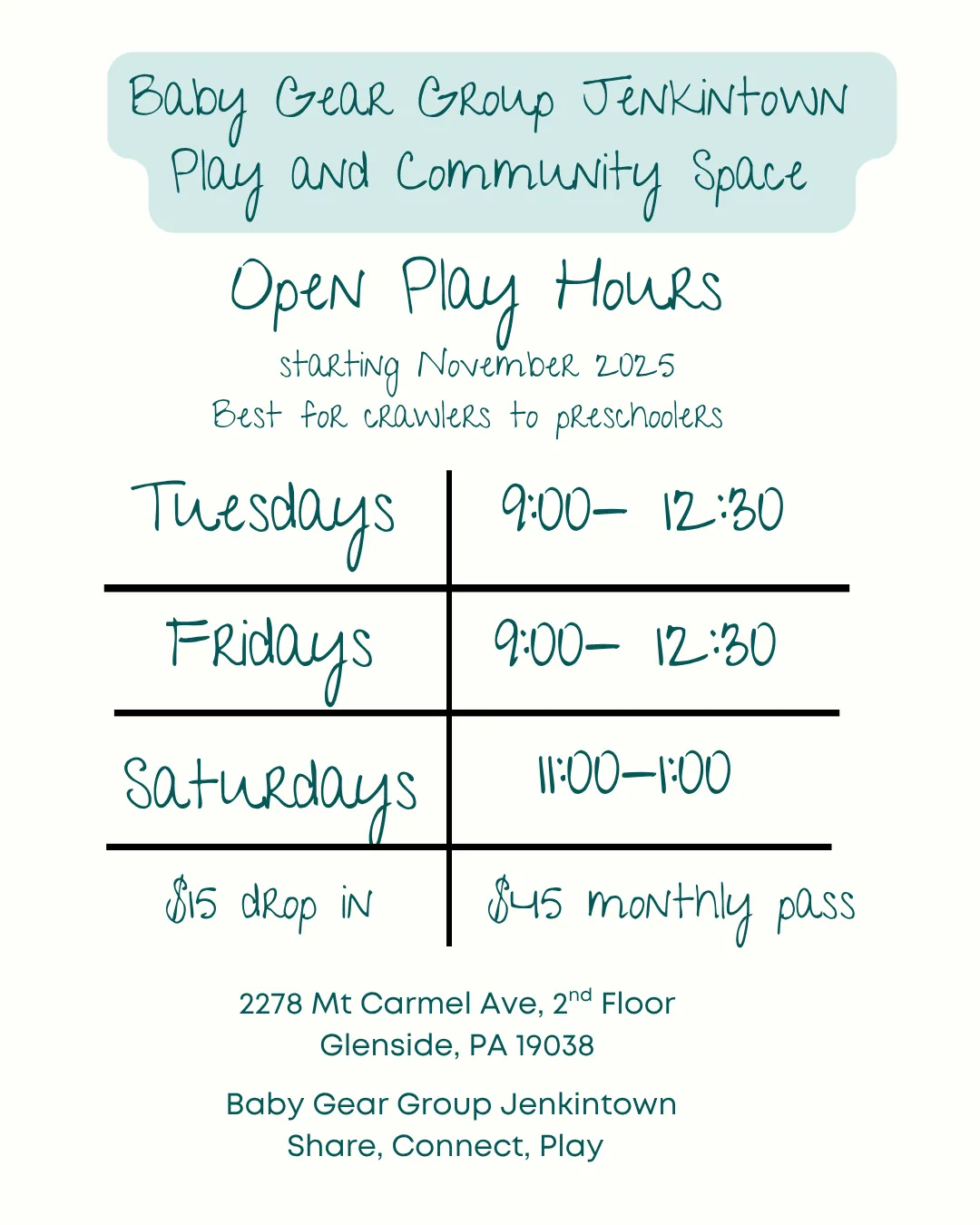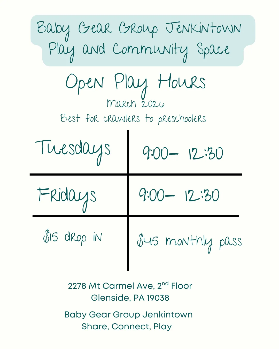 Our Play and Community Space is co-located with Third Space Fitness Collective at 2278 Mt Carmel Ave in Glenside.